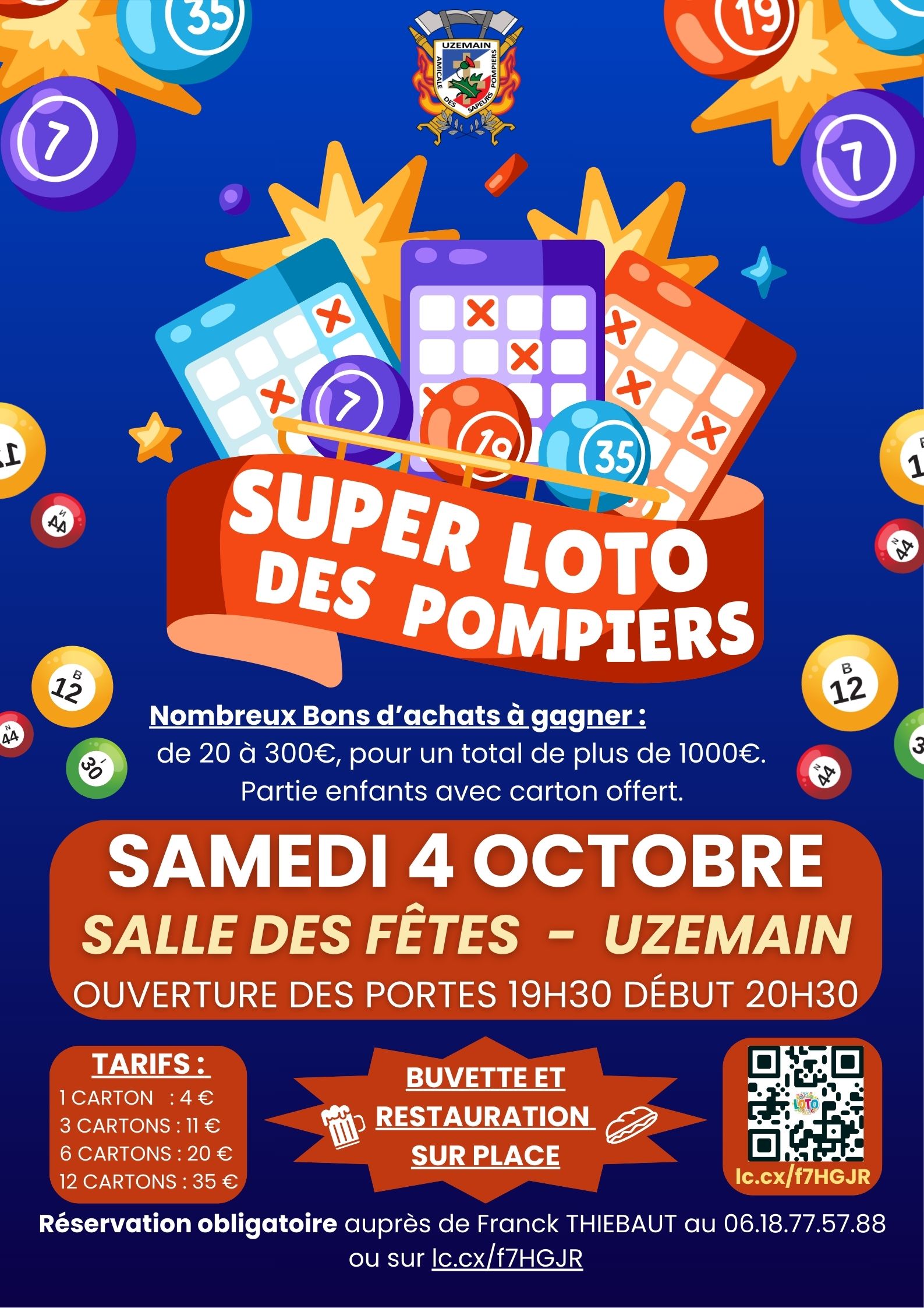Les bénévoles de l’Amicale des pompiers d’Uzemain vous attendent nombreux le 4 octobre pour leur super loto annuel !